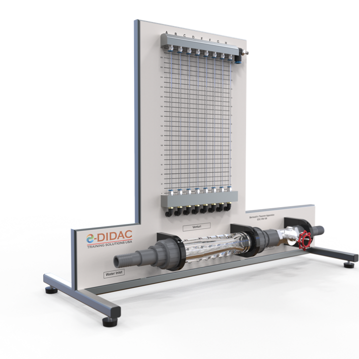 This experimental unit consists of a pipe section containing a venturi tube with transparent front panel, a