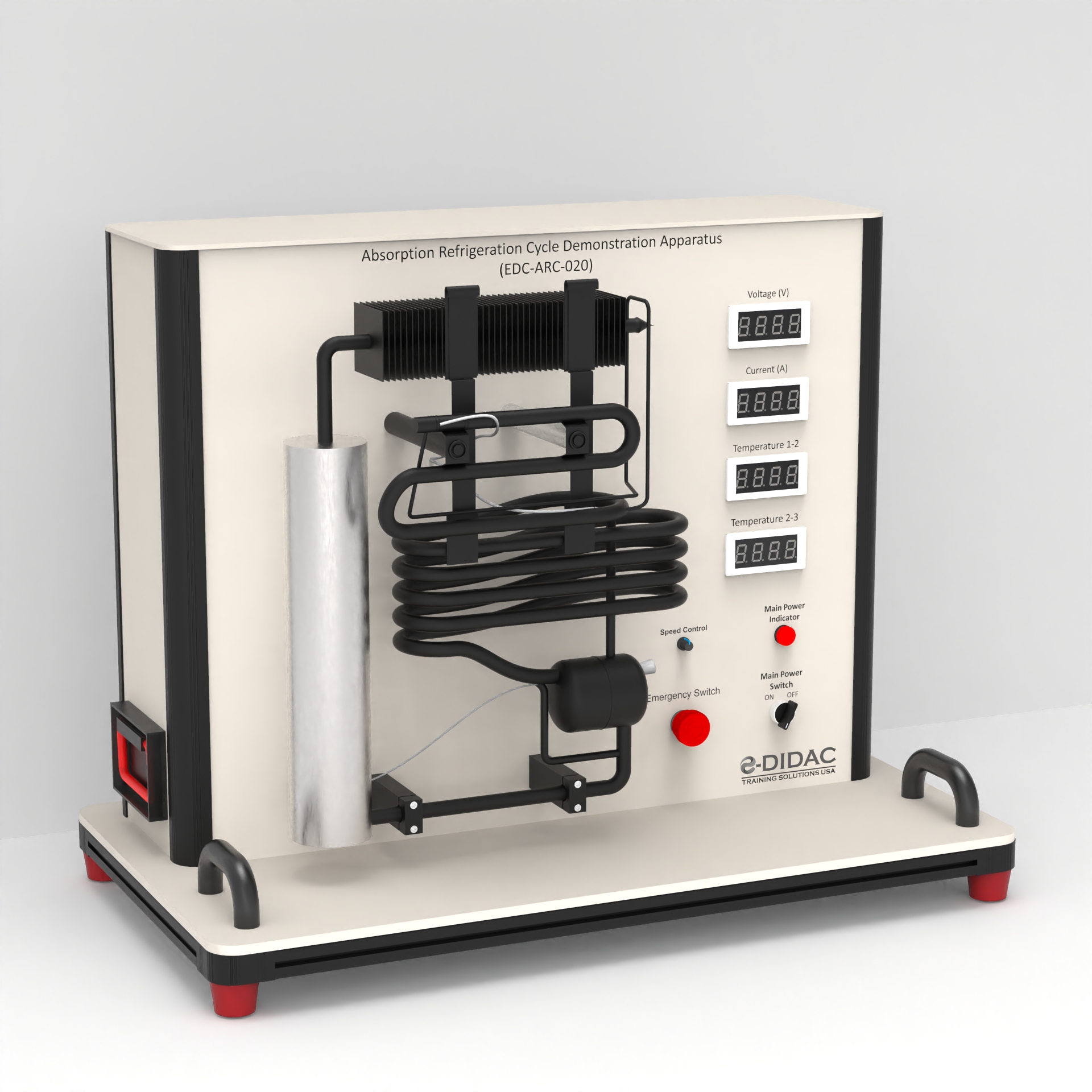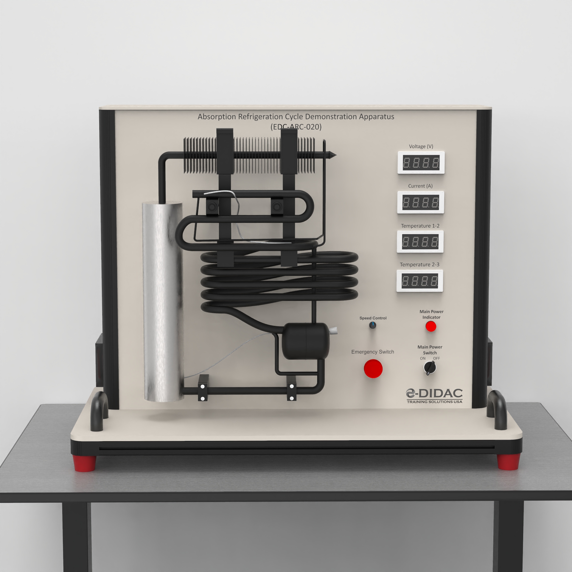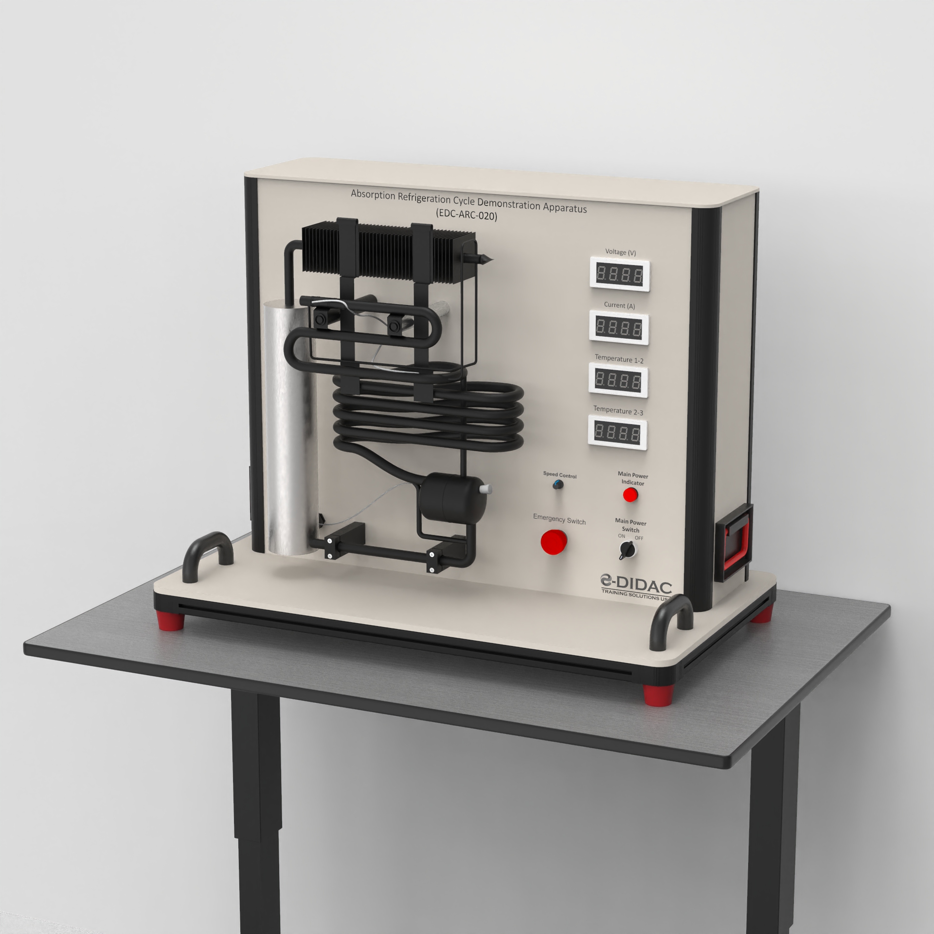 This apparatus is designed to demonstrate the principles of the vapor absorption refrigeration cycle, using an ammonia-water solution to produce a cooling effect through external thermal energy source. It allows students to observe the complete cycle, from the separation of ammonia vapor in the generator to the absorption process, and to compare the performance when using different heat sources.