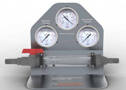 This attachment consists of a circular Venturi-shaped section manufactured from clear acrylic to enable visualisation inside the section. As the flow of water increases the pressure at the throat falls in accordance with the Bernoulli equation until a limit is reached corresponding to the vapour pressure of the liquid. At this low pressure small bubbles of vapour form then collapse violently as the pressure rises again downstream – a process called cavitation. Bourdon gauges indicate the pressure upstream of the contraction, inside the throat and downstream of the expansion in the test section. Flow control valves upstream and downstream of the test section enable the flow and pressure to be adjusted, enabling cavitation to be clearly demonstrated.